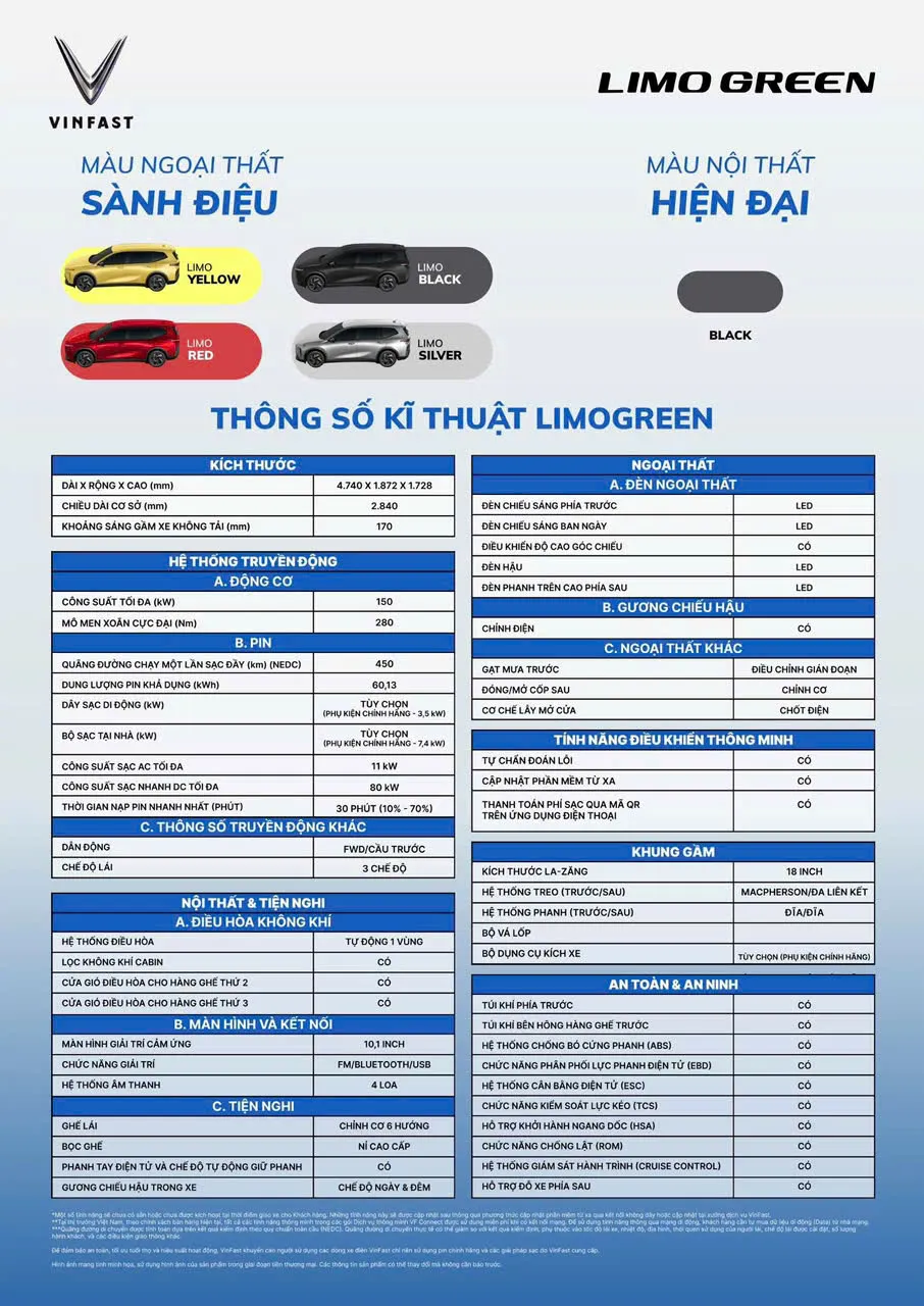 Limo Green được trang bị khối pin LFP, cho khả năng di chuyển lên tới 450 km sau mỗi lần sạc đầy. Thời gian sạc từ 10% lên 70% của xe là 30 phút, giúp tối ưu hiệu suất sử dụng của xe, phù hợp cho những chuyến đi dài.