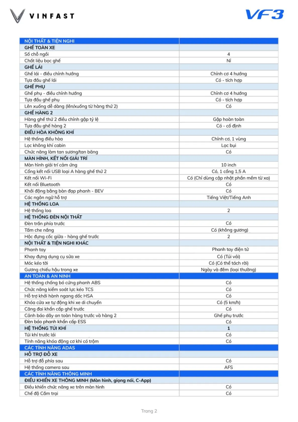 Dù sở hữu mức giá rẻ nhưng VF3 cũng có những tính năng thông minh như đồng bộ/quản lý tài khoản, chế độ Cắm trại, tìm kiếm địa điểm/dẫn đường, định vị xe từ xa, đồng bộ lịch/danh bạ điện thoại, cập nhật phần mềm miễn phí/thu phí, nhận thông báo/đặt dịch vụ hậu mãi, quản lý gói cước thuê pin trực tuyến, tra cứu/truy cập Internet,...
