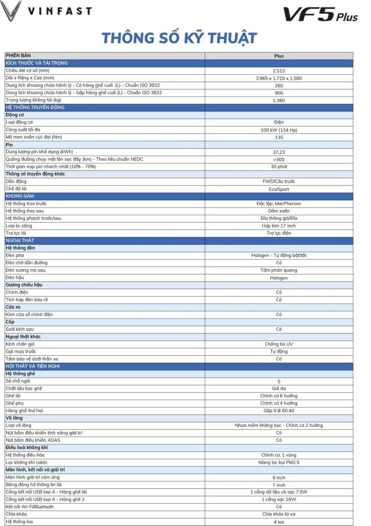 VinFast VF5 sử dụng hệ thống pin Lithium dung lượng 37,23 kWh với quãng đường cho mỗi lần sạc đầy là 300km. Tốc độ tối đa là 130 km/h. Dung lượng pin của VF5 cao hơn đàn anh VF e34 với dung lượng 42 kWh – quãng đường di chuyển tối đa cho mỗi lần sạc là 285km. Trong khi đó VF5 có thể di chuyển sau mỗi lần sạc đầy là 300km.