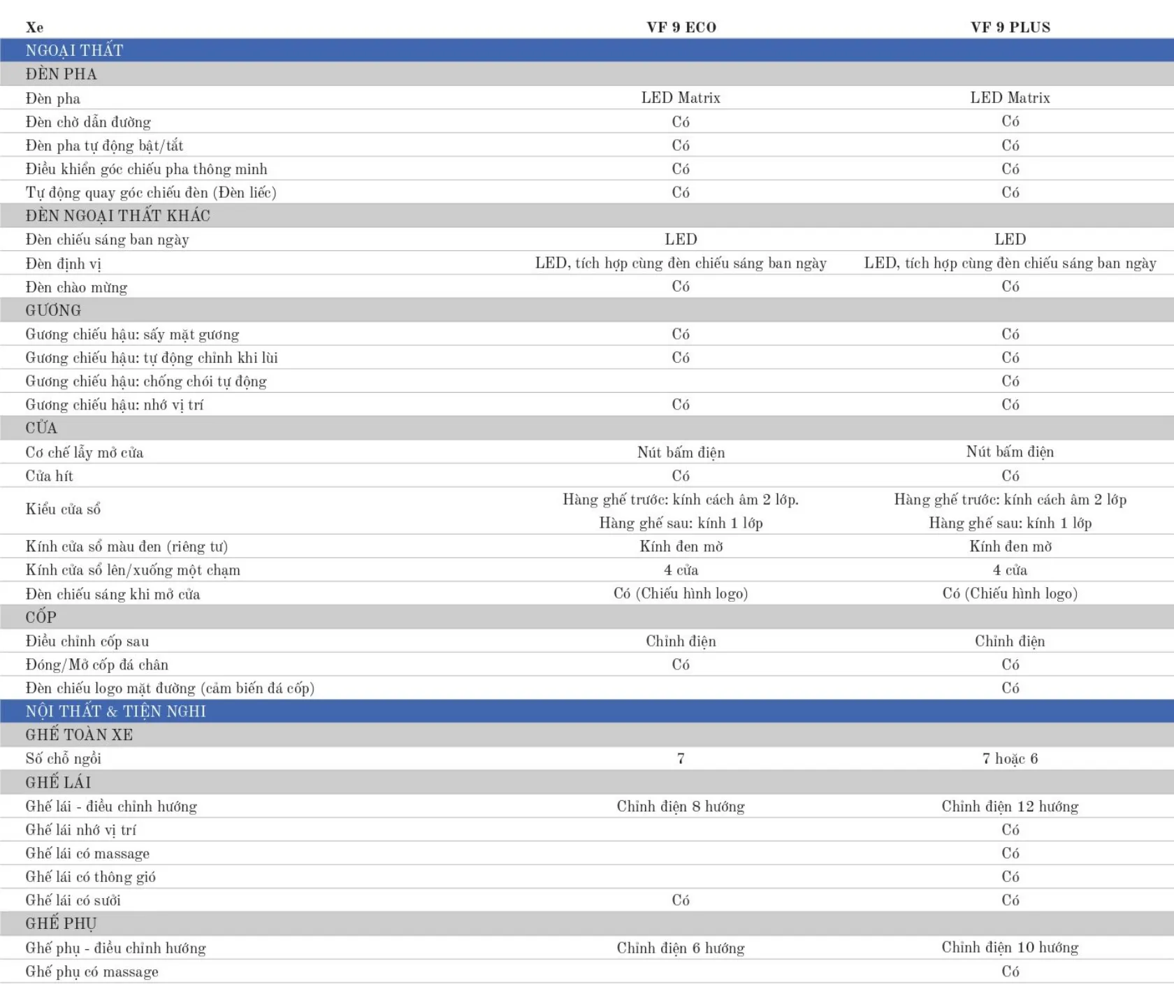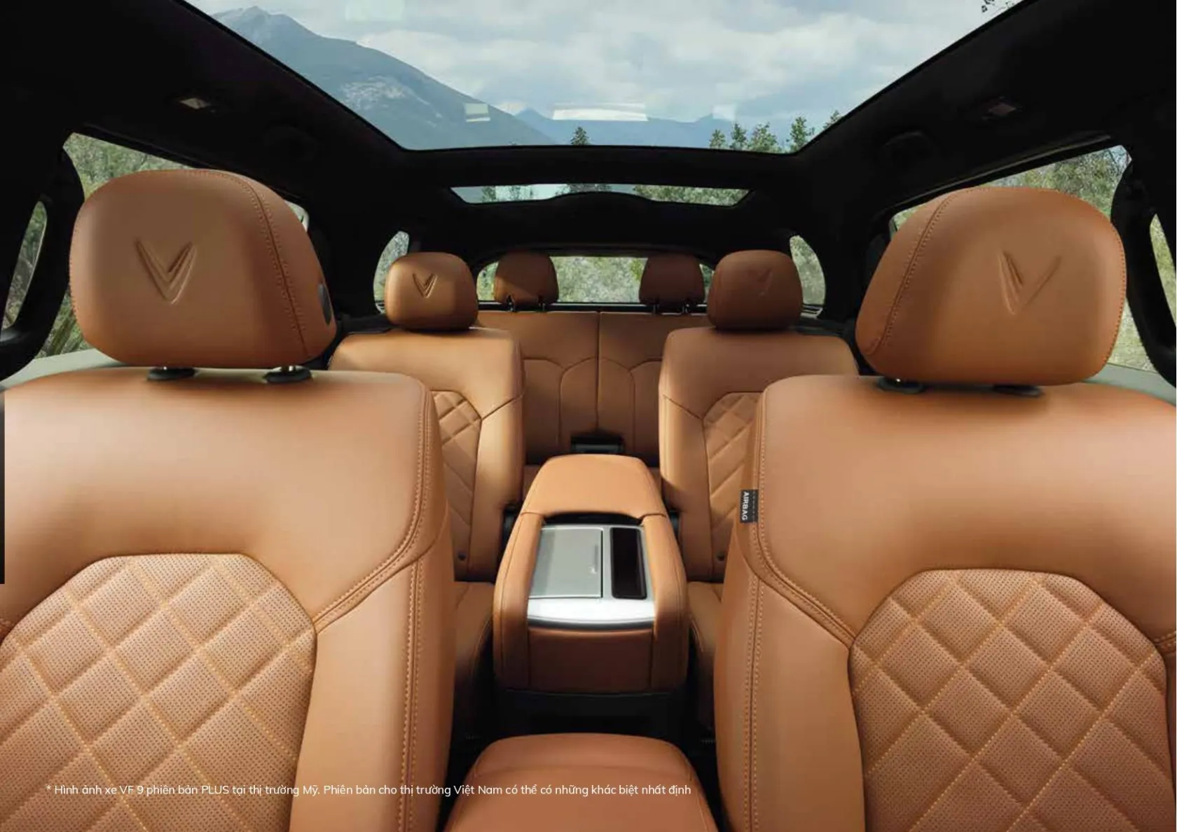 Xe có cấu hình 3 hàng ghế với 6 chỗ ngồi. Trong đó hàng ghế sau thiết kế kiểu thương gia sang trọng cùng loạt tiện ích hiện đại, tiện dụng. Khách mua xe VinFast VF 9 2025 sẽ có tất cả 8 tùy chọn màu ngoại thất, gồm: Brahminy White (trắng), Desat Silver (bạc), Neptune Grey (xám), VinFast Blue (xanh), Sunset Orange (cam), Crimson Red (đỏ), Jet Black (đen), Deep Ocean (xanh đậm).