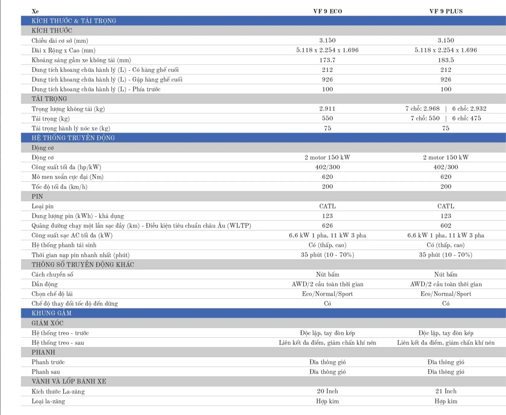VF 9 có hai phiên bản pin, trong đó bản tiêu chuẩn chạy được quãng đường 437 km, bản nâng cao di chuyển được 626 km cho mỗi lần sạc đầy.